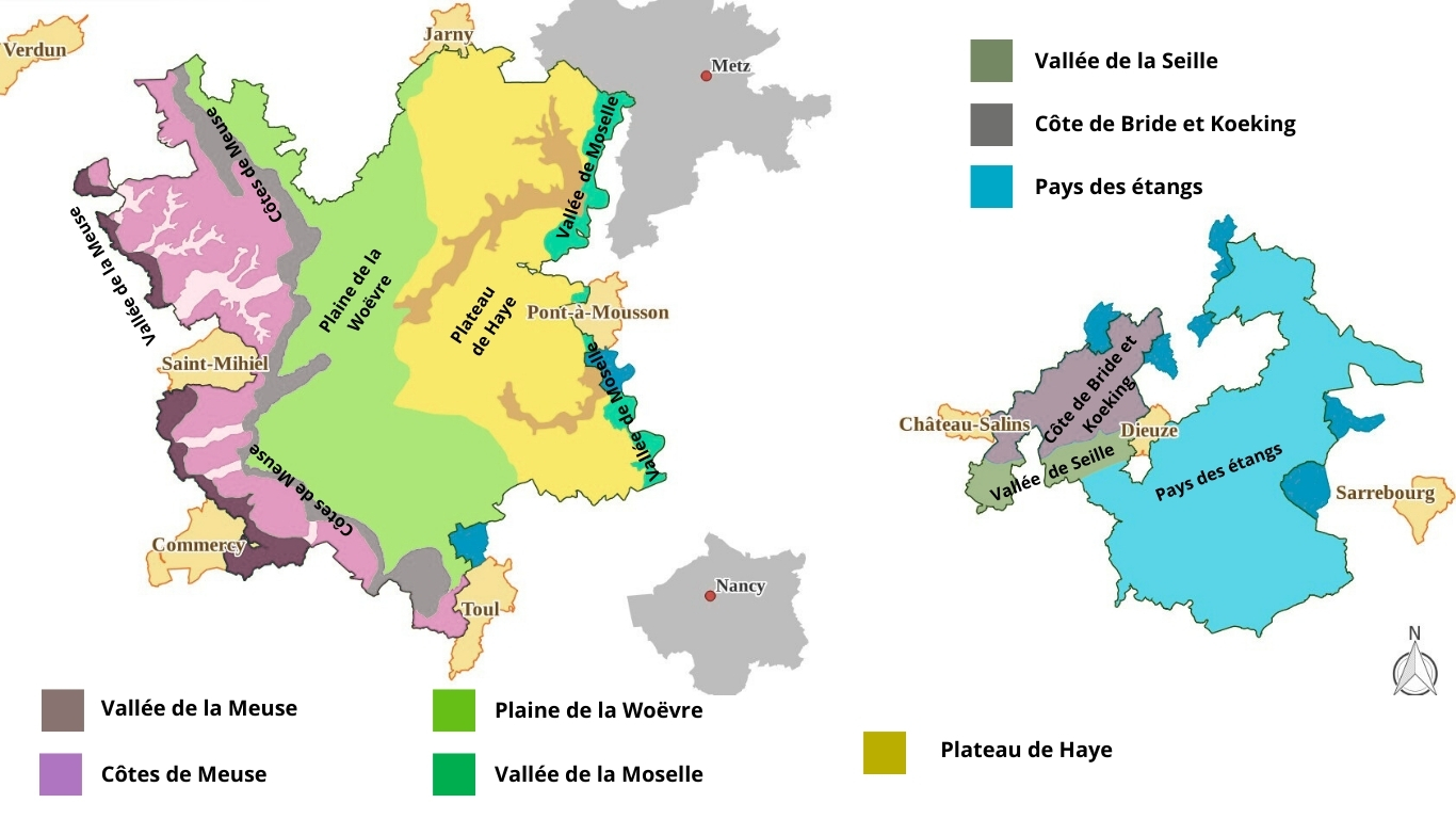 On y distingue deux grands ensembles : le Pays du Sel, autour de la vallée de la Seille, et le Pays des Étangs, avec ses multiples plans d’eau et zones humides.